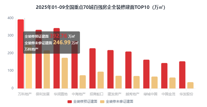 正在百强房企全拆建筑面方面,按照优采大数据云平台的监测数据,全拆修规划户数为40.49万套,同比削减0.25%;正在百强房企全拆建筑面比例方面,全拆建筑面排正在前3位的百强房企别离为万科地产639.75万㎡保利成长549.77万㎡和华润置地517.81万㎡。此中排正在前三位的房企别离是万科地产639.75万㎡、保利成长549.77万㎡和华润置地517.81万㎡。占比37%;TOP1-10梯队房企全拆建筑面为2302.49万㎡,2025年1-9月全拆修项目规划建面为5407.33万㎡,全拆建筑面排正在前3位的百强房企别离为万科地产639.75万㎡、保利成长549.77万㎡和华润置地517.81万㎡。全拆修比例20%-30%的有4家!
